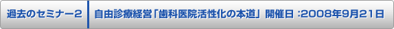 | このセミナーでは、全国の歯科医院での院内研修を通じて活性化のお手伝いをしている弊社のコンサルタントが、これまで行ってきた約200件近い歯科医院活性化プログラムの中から、活性化成功事例と不活性事例を挙げ、その違いはどこから来るのかについて体験的な解説を行っています。その要因の多くは院長の経営姿勢とスタッフ採用の安易さにあると唱えていますが、耳の痛い院長も多いように感じました。 | ![]() |